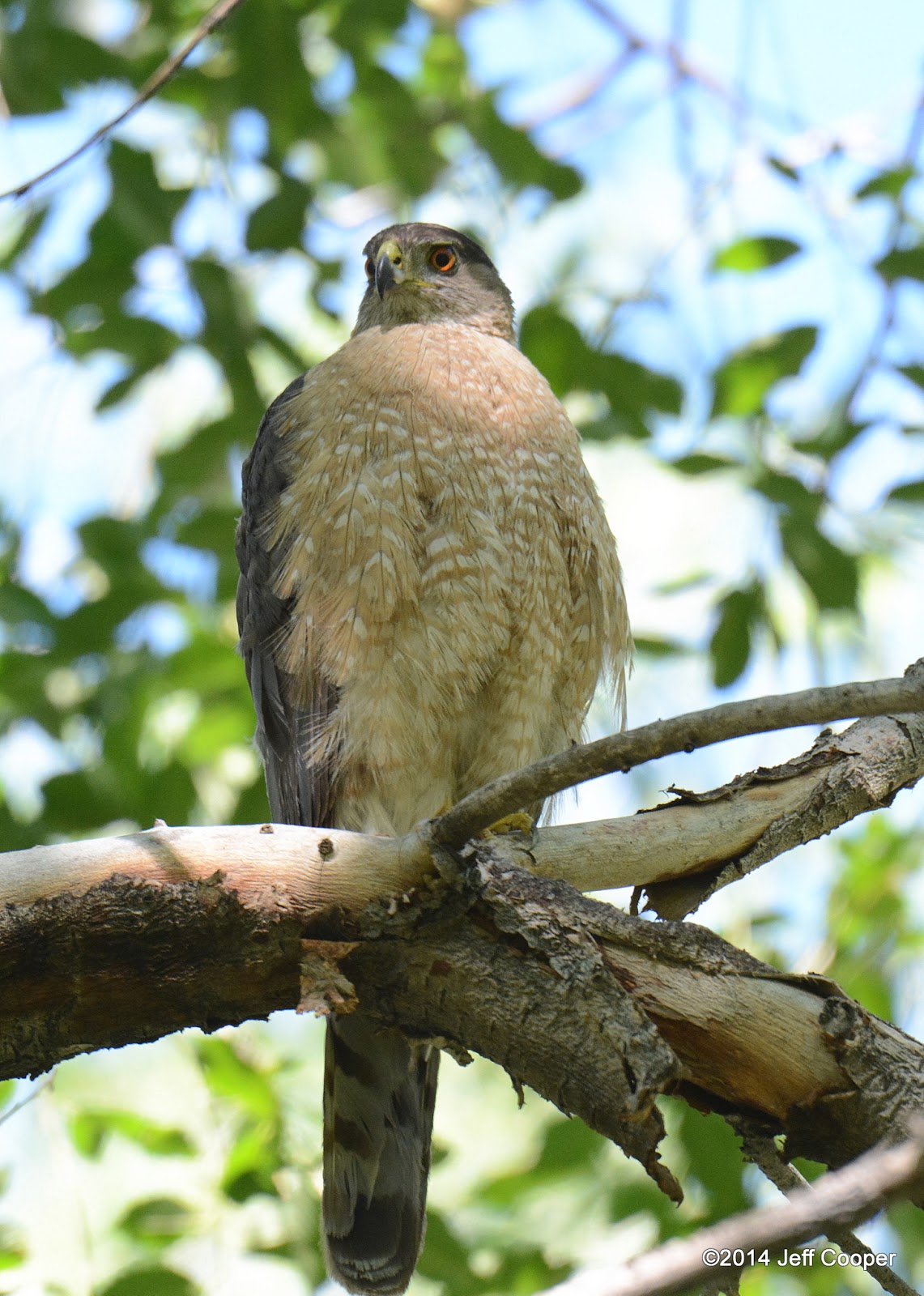 After admiring mom for a while I turned my attention back to the chicks in the nest. That was until I heard mom start making a few quiet noises. I looked back at her and noticed she was looking to her left. She gave a couple of louder "kak" calls and then flew to where she was looking. That's when I noticed she flew to the male that was waiting in a spruce tree. The two sort of collided with each other a couple feet away from the spruce. Mom flew back toward me and dad moved farther away. I wanted to get an image of dad so I walked his way. I couldn't find him so I turned back toward mom. That's when I realized that dad had actually delivered some prey when the two birds collided near the spruce. Mom was now perched on a branch and plucking downy feathers from what turned out to be a baby bird (Cooper's Hawks primarily eat other birds). She was preparing the prey for delivery to one of her own chicks.
