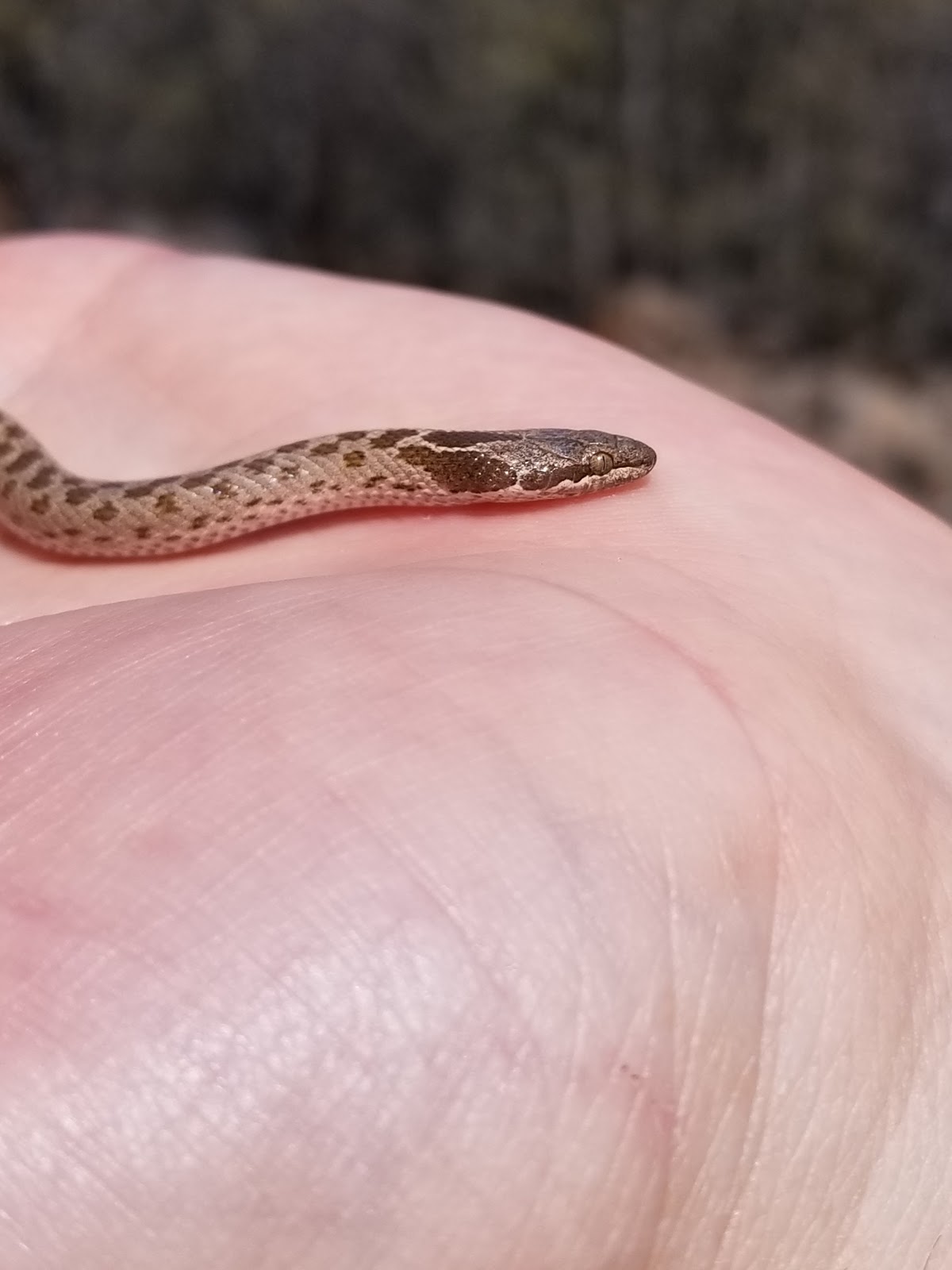 We observed Common Side-blotched and Plateau-striped Whiptail lizards as we worked our way up a hillside. Our first exciting discovery came courtesy of Pat's flipping skills. He uncovered a Night Snake. These first two images were captured with my phone with the snake in hand to show relative size.